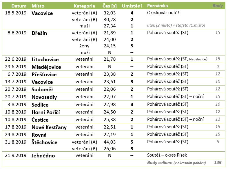 Nesplněný sen – třeba tak by se dala nazvat pouť našeho veteránského družstva seriálem soutěží v roce 2019. Přestože časy útoků se proti předchozím letů výrazně zlepšily, mnoho tréningů a rady trenéra vnesly jistotu do rukou závodníků – pořád je to sport a všechno se prostě nepovede. V posledním závodě ve Štechovicích, kde se rozhodovalo o celkovém vítězi, se objevila u našeho veteránského „A“ družstva chybička, která rozhodla vše! Možná jsme až moc chtěli vyhrát, možná se odklonilo pověstné „sportovní štěstí“ – kdo ví. Každopádně se musíme letos spokojit s 2. místem, celkový vítězem se stali Černětice. Jako malá náplast byla celková 5. příčka našeho družstva „B“, které se zúčastnilo pouhých 2 závodů.