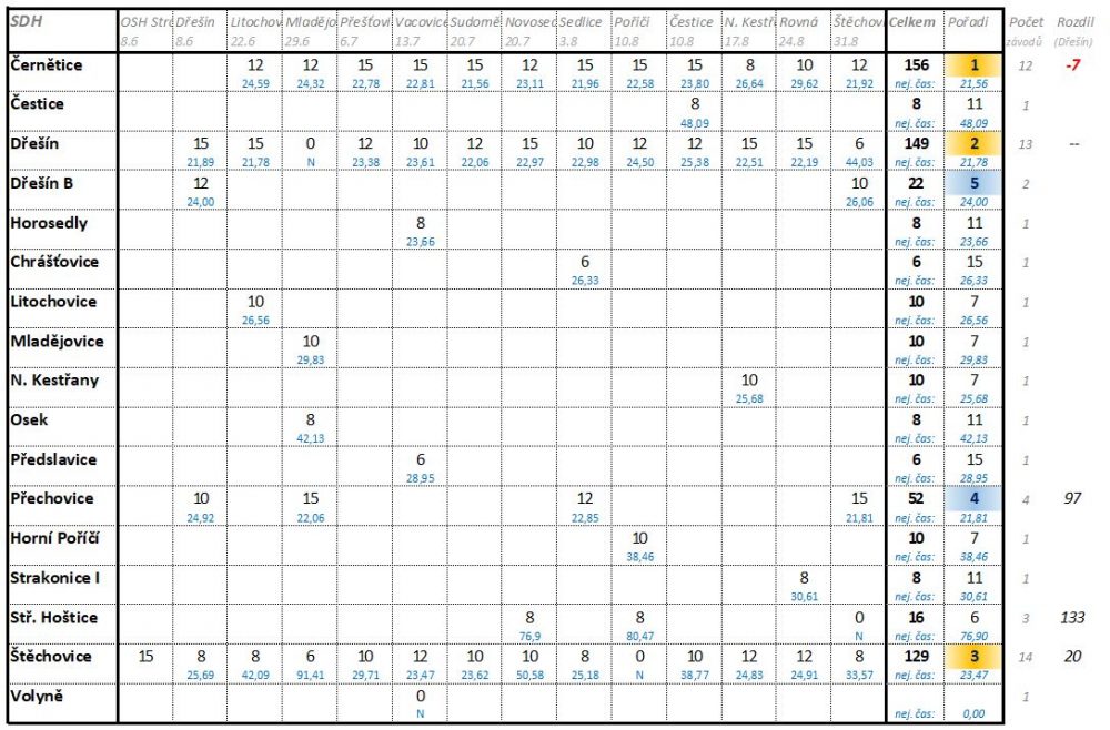 Ze Dřešína bylo (oproti loňskému roku) opět o 1 družstvo méně. V kategorii „muži“ soutěžil jen 1 tým, kategorie „veteráni“ měla 2 od nás zástupce. Do třetí kategorie („ženy“) jsme již nezasáhli ani vloni. Začněme kategorií „veteráni“. U soutěžního družstva Dřešín A se objevila malá chybička a s časem 32,03 obsadili 4. místo. Lépe si vedlo družstvo Dřešín B, které skončilo na 2. místě s časem 30,28. Zvítězili veteráni ze Dřešínka (28,98). V kategorii „muži“ měla suverénně nejlepší útok Doubravice (22:87), ale čas 27,34, který dosáhli muži Dřešín, byl 2 nejrychlejší. Na štafetě pak naši muži byli nejrychlejší a v závěrečném součtu, protože Doubravice byla na štafetě až třetí, to znamenalo zlato! To bylo velké překvapení při závěrečném nástupu, protože s 1. místem jsme opravdu nepočítali.